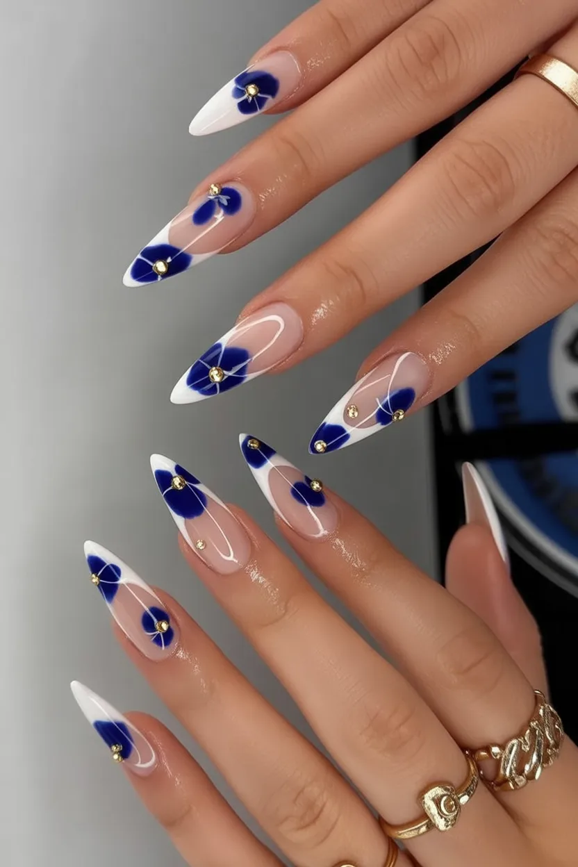 This floral French style feels fresh and sophisticated at the same time. The crisp white tips combined with bold Blue flowers create a striking contrast that still feels balanced and elegant. It’s the kind of manicure that makes your hands look instantly polished while still celebrating the season.