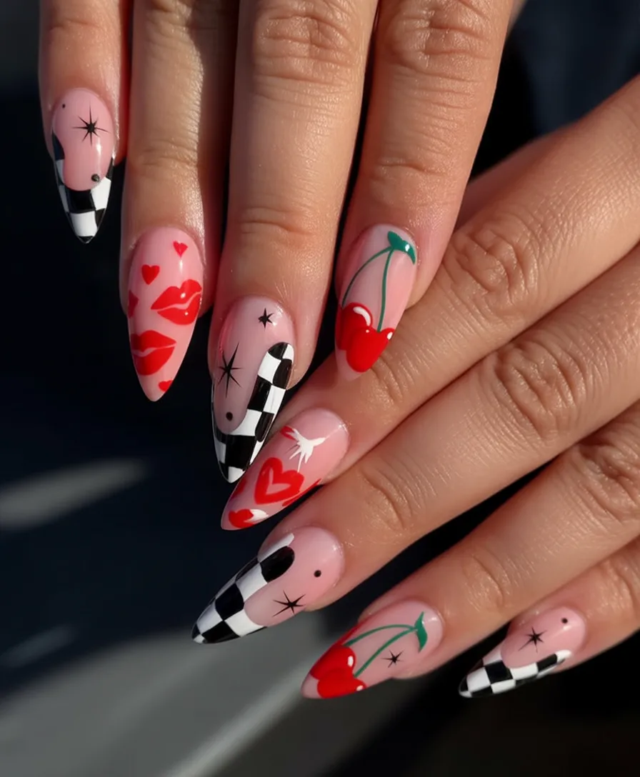 These bold cherry nails bring a playful personality that instantly feels celebratory. Between the hearts, checkered accents, and bright details, this manicure has a lively energy that feels perfect for a birthday outing with friends. It’s a fun mix of retro charm and modern creativity that makes the whole look feel expressive and unique.