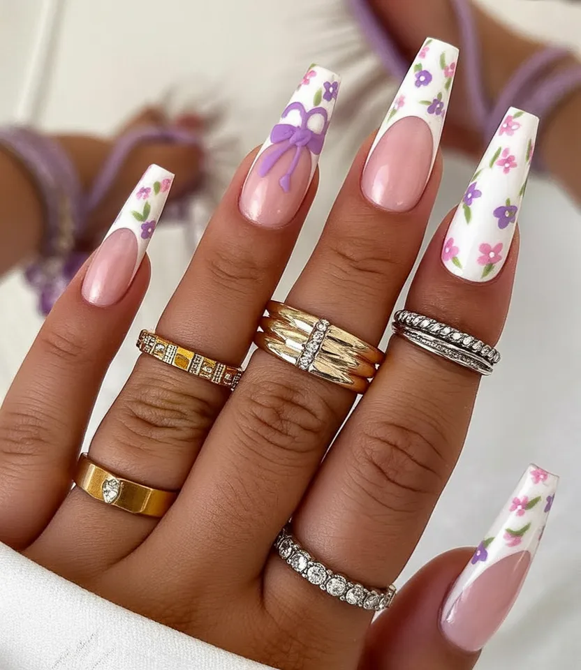 This manicure feels like a gentle nod to spring without being overly sweet. The soft floral French tips combined with a subtle bow detail give the whole look a delicate personality that feels thoughtful and feminine. It’s the kind of birthday manicure that looks beautiful in photos and still feels refined enough for everyday life.