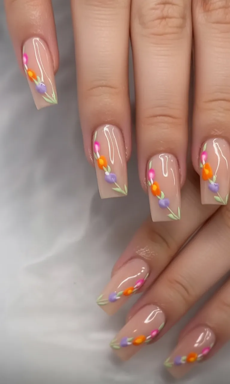 These colorful floral nails feel like the first warm weekend of spring—bright sunlight, fresh air, and a sense that something new is beginning. The soft pink tones paired with tiny flowers create a cheerful birthday mood that feels uplifting without being overwhelming. It’s an easy choice if you want your manicure to feel seasonal and joyful.