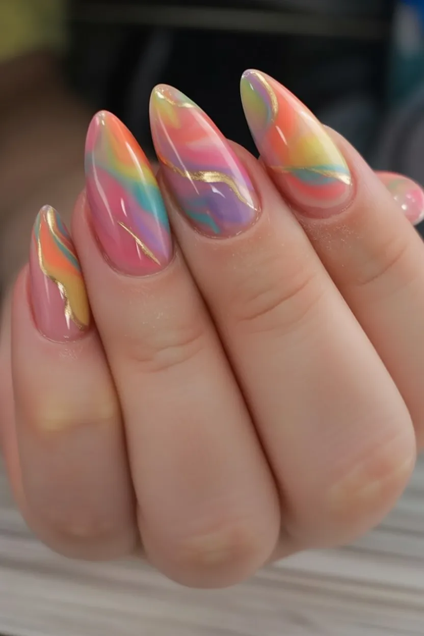 These colorful marble nails feel like a celebration of creativity. Swirls of pastel shades blend together into a soft rainbow effect that looks artistic and modern without feeling overwhelming. The subtle gold accents add just enough shine to make the whole manicure feel birthday-worthy and special.