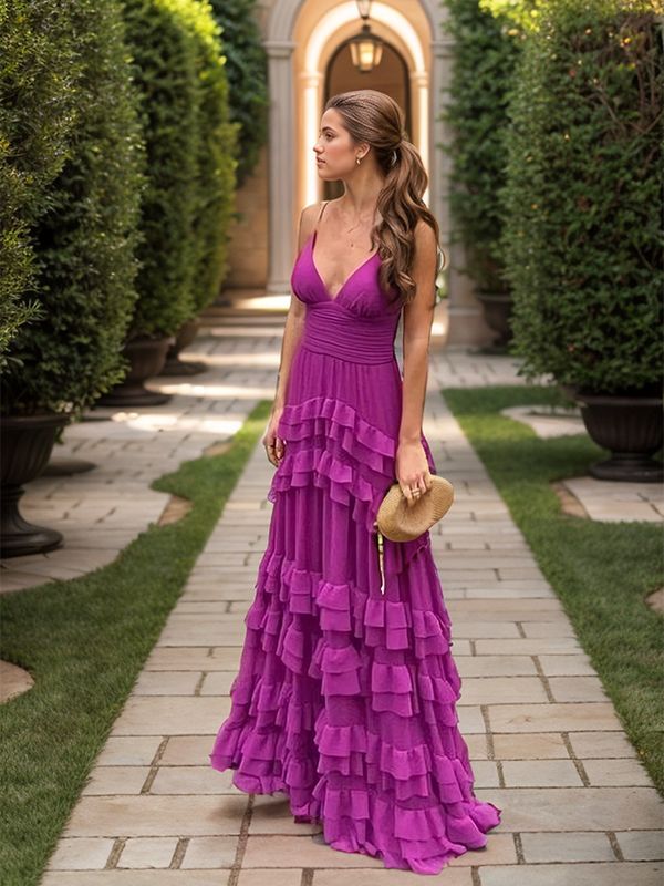 For bridesmaids who want a regal touch, this deep purple gown with layered ruffles brings effortless elegance. The plunging neckline balances the structured bodice, while the tiered skirt adds flow and drama. This shade complements a wedding colors scheme featuring jewel tones or soft pastels for a stunning contrast. Style it with gold accessories for a refined and sophisticated touch.