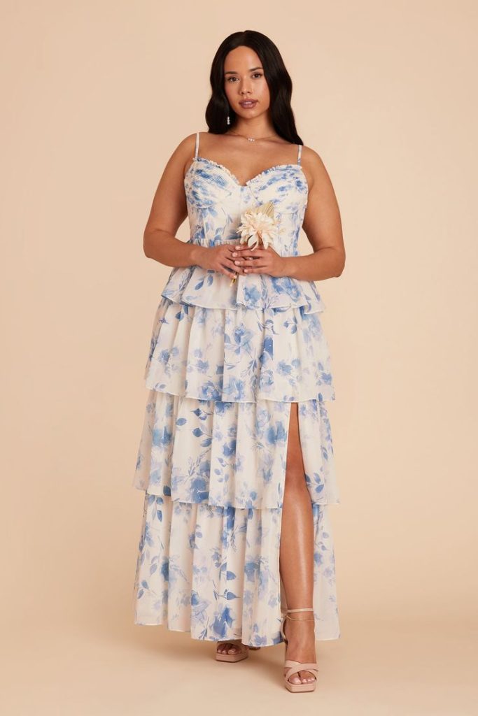 Blue remains a timeless bridesmaid color, and this floral-printed gown brings a fresh spin to the classic shade. The tiered skirt and soft ruffles add dimension, while the sweetheart neckline enhances femininity. Designed for plus size bridesmaids, this silhouette flatters every shape and ensures comfort. Pair with silver heels and delicate pearl earrings for a graceful, elegant finish.