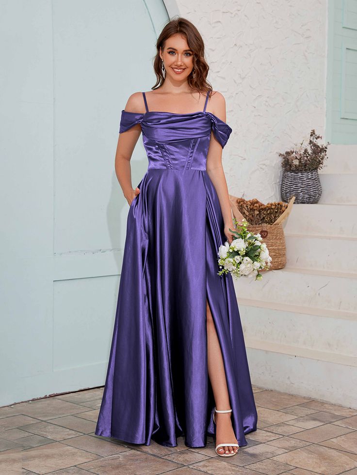 Nothing exudes elegance quite like purple satin. This off-shoulder gown features a structured bodice that flatters every silhouette, while the flowing skirt and high slit add a modern touch. The rich color palette makes it a stunning choice for evening weddings, effortlessly complementing deep floral arrangements.