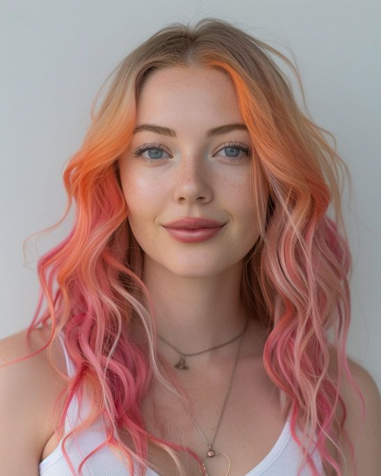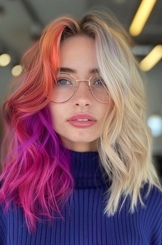 This eye-catching two-tone hairstyle combines vibrant pink and orange hues with a natural blonde base. The contrasting colors create a bold and playful look that’s perfect for those who love to stand out. The money piece highlights in pink and orange add an extra touch of drama and fun to the style.