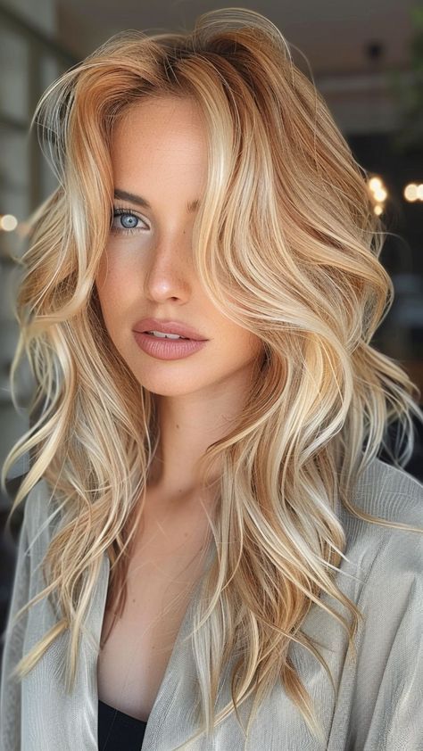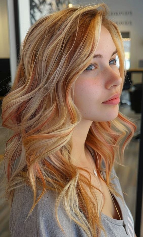 This soft peachy blonde look is perfect for those who want a subtle yet unique hair color. The peach tones blend beautifully with the blonde base, creating a fresh and modern look. The gentle waves add movement and texture, making it a perfect style for fall.