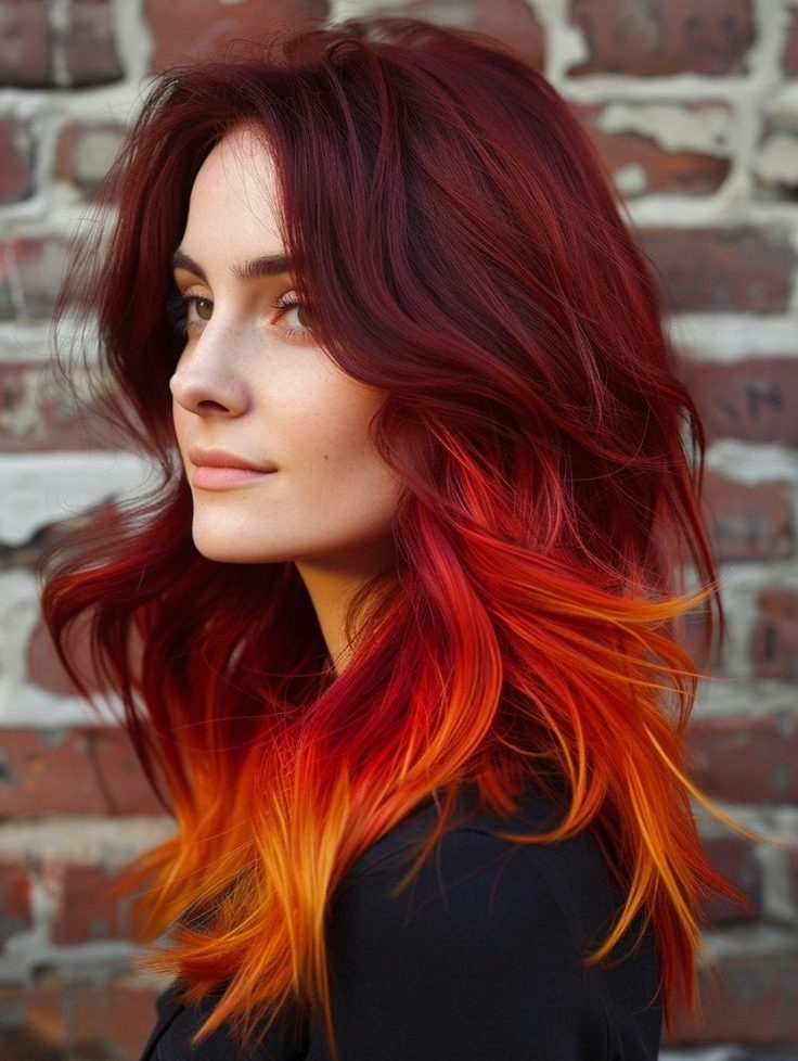 For a bold and dramatic look, this fiery red ombre hairstyle transitions from deep red roots to bright orange ends. This ombre style is perfect for those who want to make a statement and embrace the fiery colors of fall.
