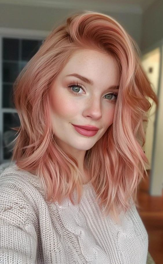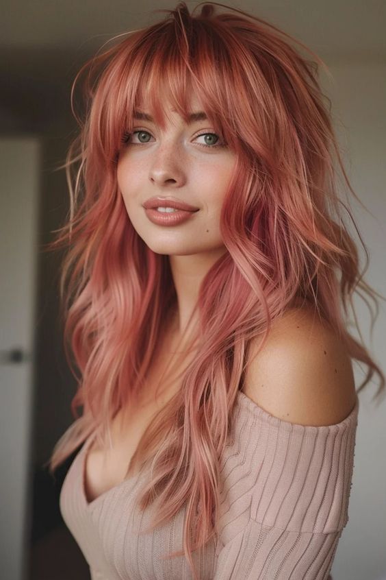 Rose gold continues to be a trendy choice for blondes. This hairstyle features a soft, rosy hue that enhances the natural blonde base. The addition of bangs gives the look a fresh and youthful vibe. Perfect for those who love a fun and trendy color that’s still sophisticated enough for everyday wear.