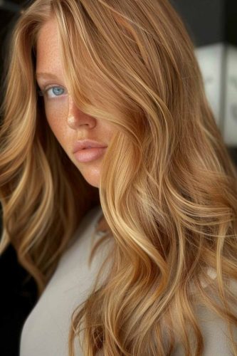 This look features a soft strawberry blonde base with subtle highlights to add depth and dimension. The gentle waves create a natural and effortless appearance that’s perfect for everyday wear. The highlights enhance the strawberry blonde color, making it look fresh and vibrant.