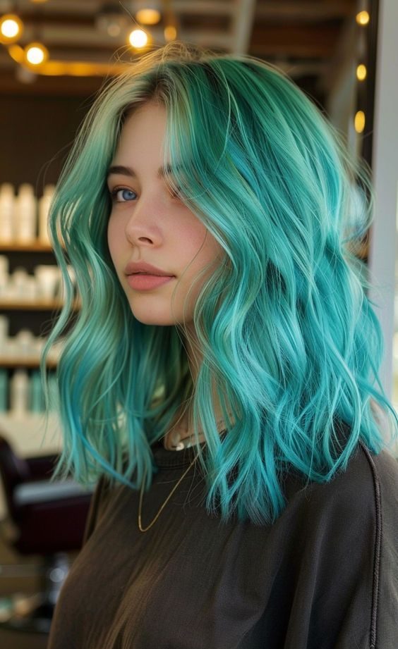 If you’re feeling adventurous, why not try a bold aqua blue? This look features vibrant blue waves that add a pop of color and personality. Ideal for those who love to stand out, this trendy color is sure to turn heads and add a splash of excitement to your fall look.