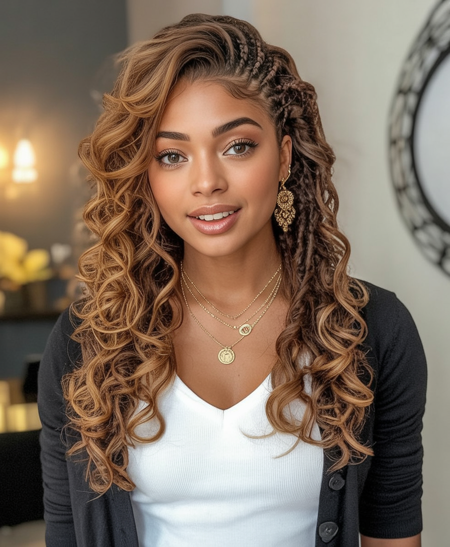 There’s something ethereal about this braided-to-curly transformation. Wavy golden curls raining down from the braids bring out a mix of Greek goddess and modern pop star look that’s simply wonderful.