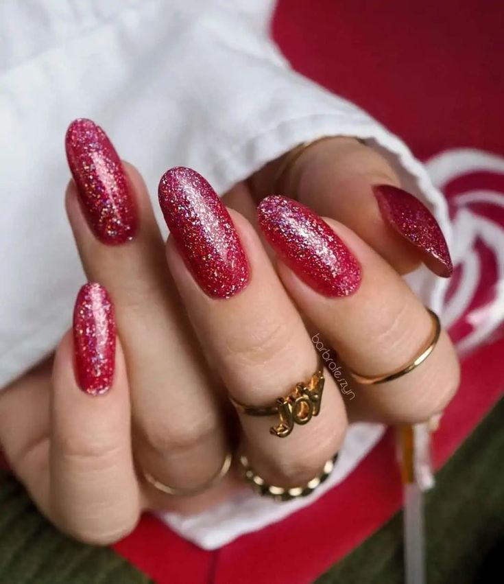 For those who love bold statements, these ruby-red nails with glitter accents exude confidence and elegance. The gel polish enhances the vibrancy of the color, making it perfect for evening events or special occasions. Pair with gold jewelry to amplify the glam factor.