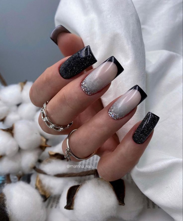 If you’re looking for a chic and edgy design, these nails feature a combination of black and silver glitter with a matte finish. The neutral tones make them versatile, while the sparkle adds a touch of glamour. This style pairs wonderfully with monochrome outfits or sleek evening dresses.