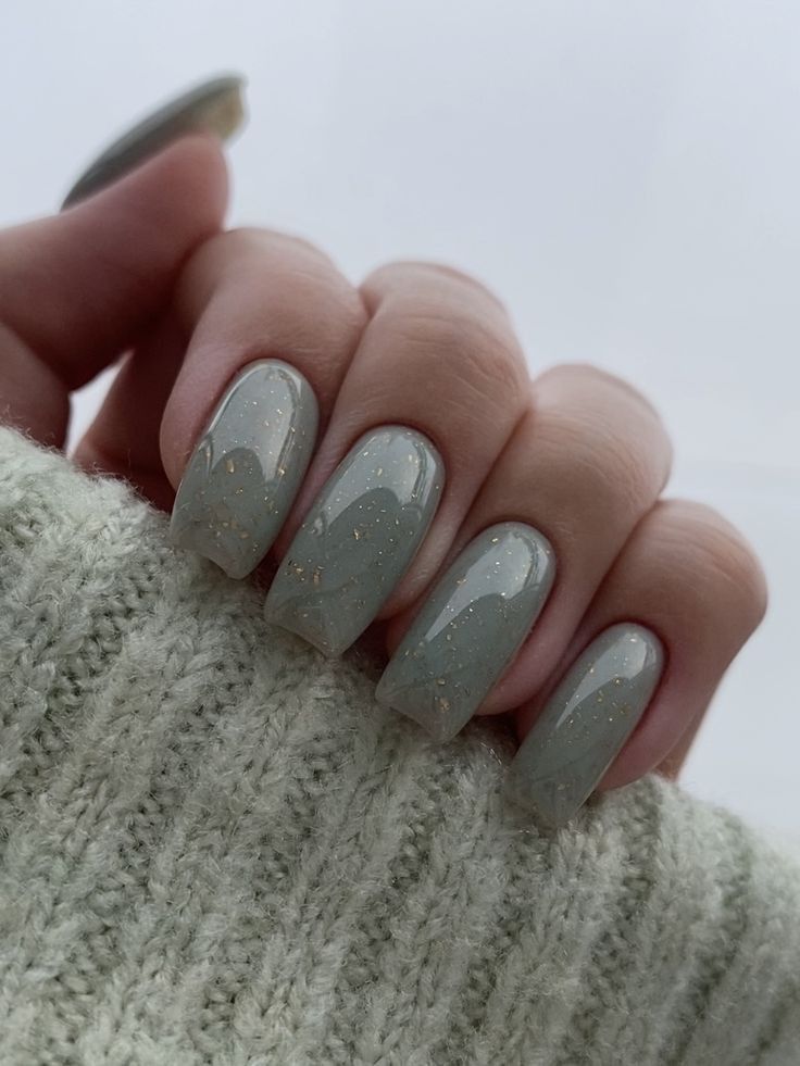 This muted green nail design with delicate gold flecks is perfect for women who prefer understated elegance. The neutral tones create a versatile look that works well for both casual and professional settings. Pair with a cozy spring sweater for a harmonious aesthetic.