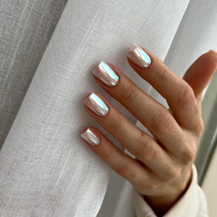 These short nails shine with a pearlescent finish, radiating subtle sophistication. The light pink undertones make them a versatile choice for any occasion, from a casual day out to a formal event. Pair with minimalistic jewelry for a clean, modern look.