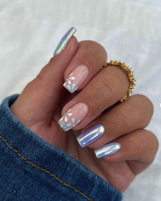This design combines blue and pink floral accents on a soft neutral base, giving your nails a fresh and feminine look. The subtle holographic effect on alternating nails adds a modern touch. Ideal for spring picnics or romantic outings, this design complements light, floral outfits.