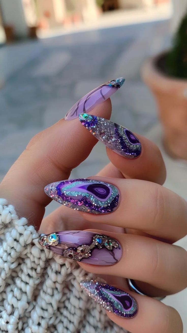Dive into a galaxy-inspired trend with almond acrylic nails showcasing bold purples and intricate gel designs. Accented with shimmering crystals, this look screams high fashion. It’s ideal for evening events where your nails can truly shine. Consider matching with deep purple or metallic accessories for added flair.