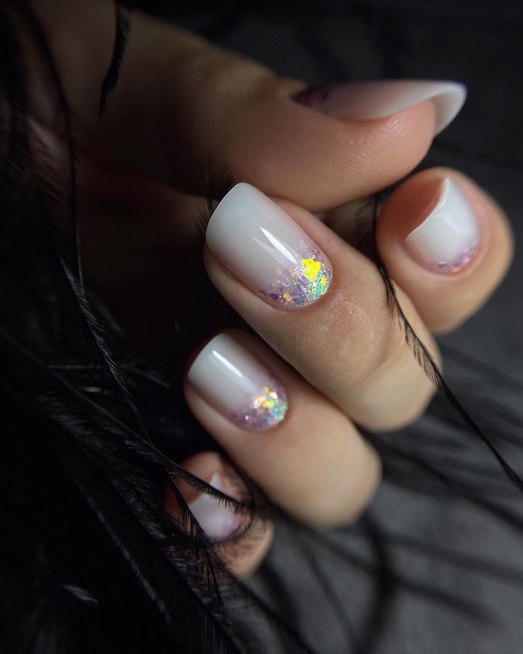 Minimalists will adore this neutral nail design, featuring clean white polish with glitter-infused tips. The hint of sparkle adds a festive touch while maintaining elegance. This style pairs beautifully with soft, flowy spring dresses or office wear.