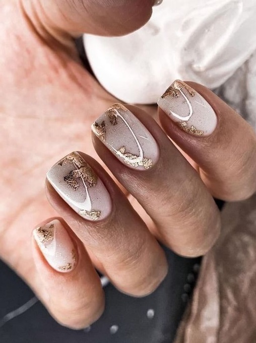 Finish the list with this elegant gel design featuring a soft blush ombre and gold foil accents. The combination of light pink and metallic tones makes it a standout choice for both casual and formal occasions. Pair with lacy spring dresses for an ethereal vibe.