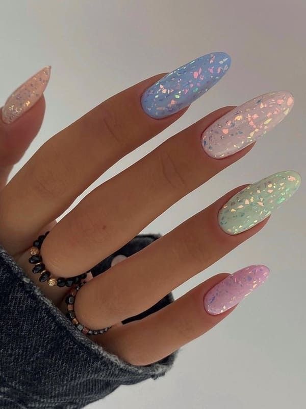Celebrate spring with a burst of pastel shades! This design showcases almond-shaped nails painted in soft blue, pink, green, and lilac hues, topped with a holographic glitter finish. Pair these cheerful colors with a floral outfit to channel ultimate spring vibes.