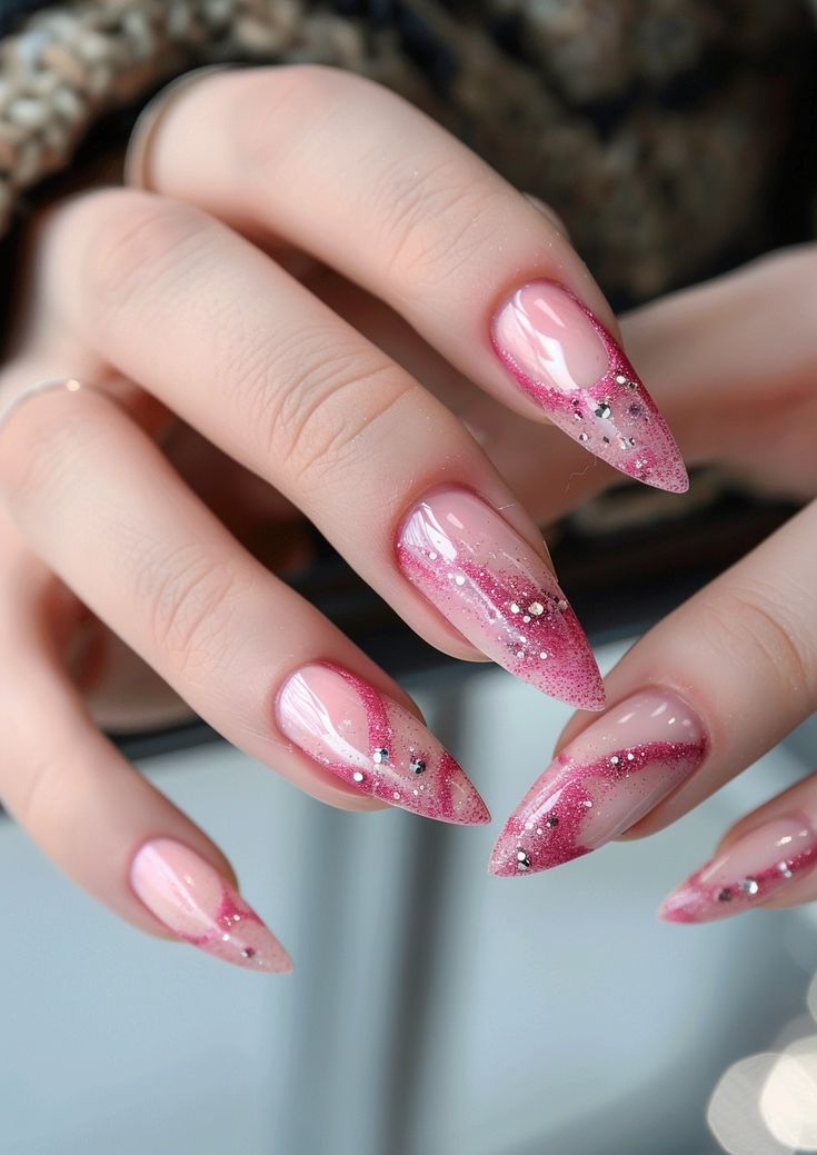 Pink and gel designs are a match made in heaven, as seen in this romantic gradient. The design is completed with small rhinestones that add an elegant charm. It’s perfect for date nights or spring weddings, radiating warmth and sophistication.