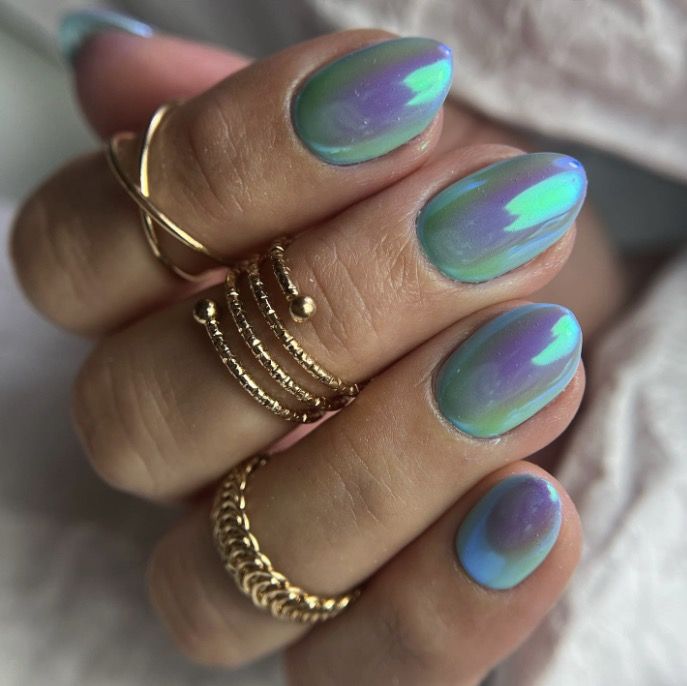 Channel an aquatic-inspired look with blue and iridescent shades. These nails are short yet stunning, showcasing a subtle shimmer that captures the light beautifully. It’s a refreshing and chic option for any casual spring outing.