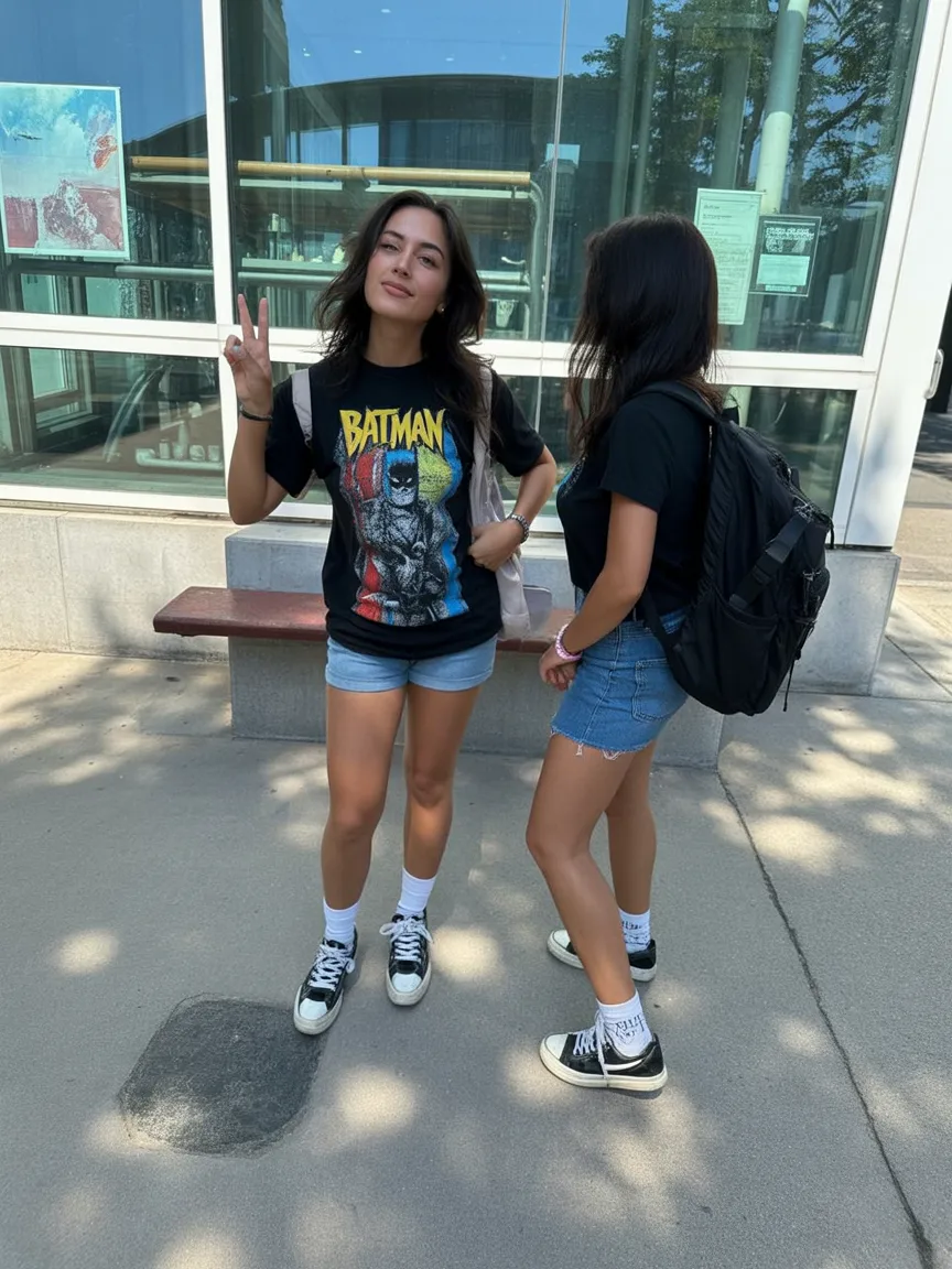 There is something so instantly likable about a roomy graphic tee with light cutoff shorts in summer. It feels cheerful, young, and completely unforced, like the kind of outfit you throw on in two minutes and somehow still get compliments on all day. The black tee brings in that cool-girl edge, while the pale denim keeps the whole thing feeling sunny and Cute instead of heavy. It gives off major Inspo for those school mornings when you want to look fun but not like you spent an hour planning every detail. The vibe is casual in the best way, easy to move in, easy to repeat, and honestly one of those Ideas that never lets you down when the weather is blazing.
