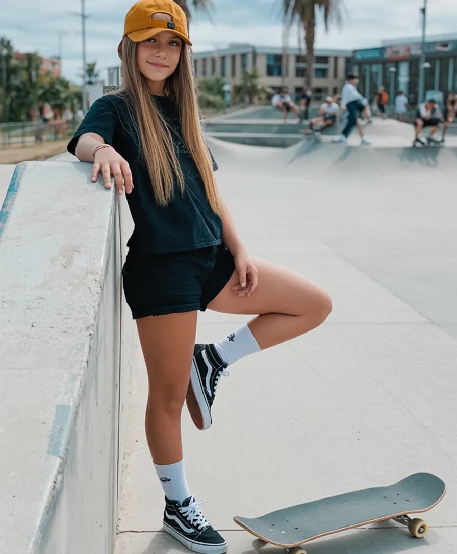 Some outfits do not need extra fuss to feel cool, and this is the perfect example. A black tee with black shorts sounds simple on paper, but once you add the baseball cap, sporty socks, and skate-style sneakers, it suddenly feels intentional and very current. It has that easy, sun-faded weekend mood that somehow still slips right into a summer school routine. The monochrome base is what makes it work so well. It looks clean, relaxed, and quietly confident, almost like the uniform of the girl who always looks put together without overthinking anything. This kind of casual formula is especially good when you want to look stylish but also stay Comfy from the first period to the last bell.