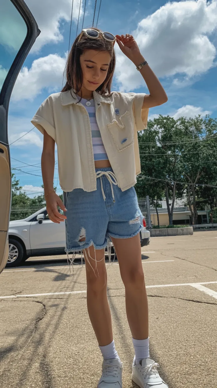 This look feels soft, sunny, and just a little polished in a way that makes you seem instantly more put together. The light overshirt adds a breezy, almost coastal touch, while the striped top underneath keeps things youthful and playful. Then you get those relaxed denim shorts, which bring everything back to earth and make the outfit feel school-friendly instead of overly styled. There is something very fresh about this mix of light layers and washed blue denim. It has that sweet summer aesthetic without tipping too precious, and it feels like the kind of outfit you wear when you want to look thoughtful but still stay cool. Honestly, it is one of those appropriate casual combinations that quietly does a lot.