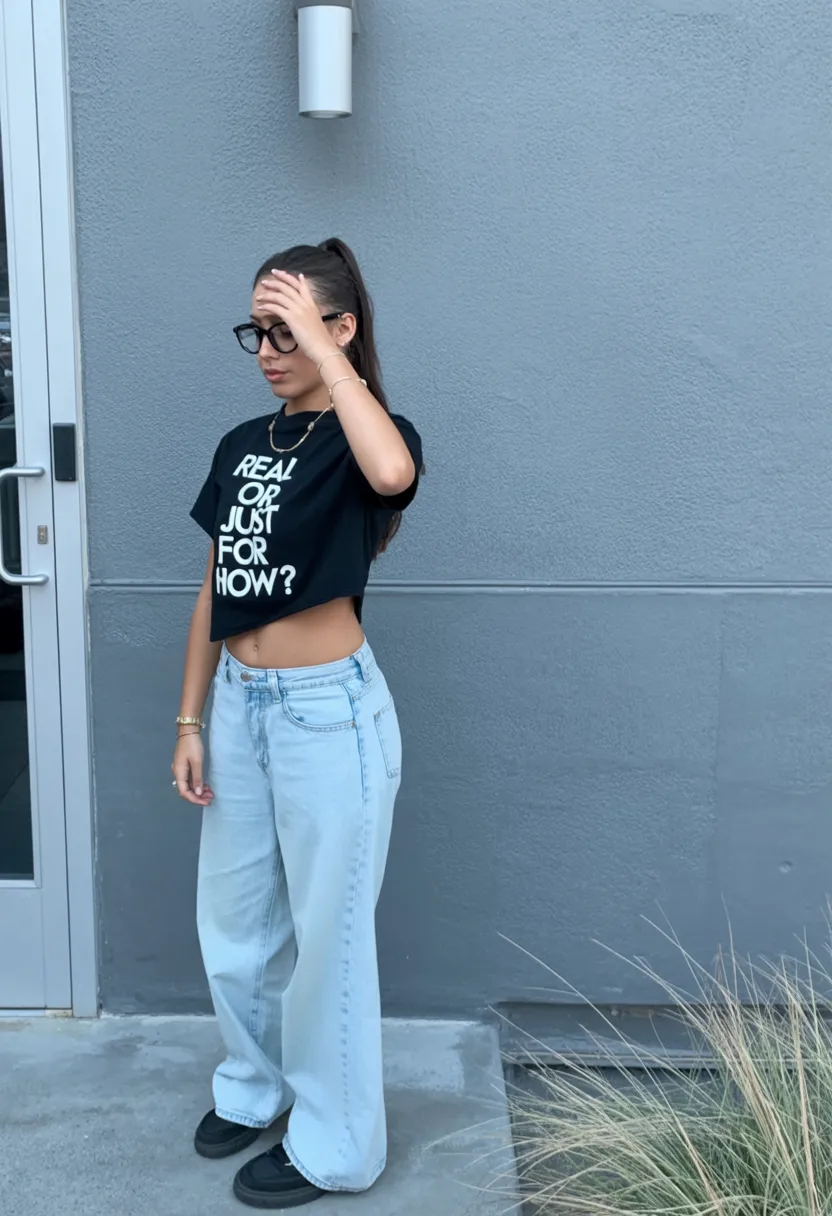 This outfit has that playful street-style spark that makes a simple school look feel memorable. The cropped black graphic tee brings a little attitude, while the pale baggy jeans soften everything and keep it grounded. It feels youthful, a touch cheeky, and very now, especially for girls who like mixing comfort with a little edge. I can see why this shape keeps showing up in style Inspo boards. It gives you room to move, it photographs well, and it has that cool contrast of fitted on top and loose on the bottom that always works. There is a little appropriate baddie flavor here too, but it still feels light and wearable for daytime instead of overdone.