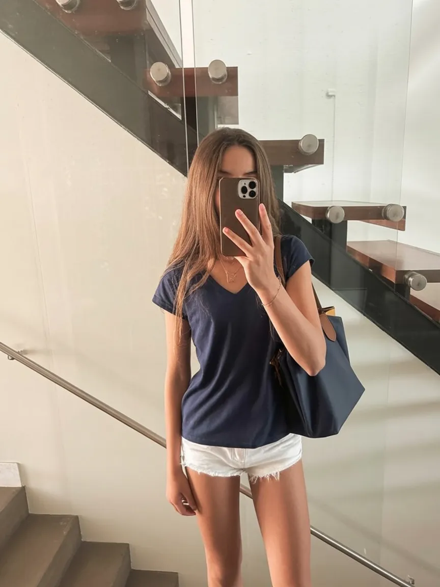 This outfit feels crisp in such a satisfying way. The navy tee brings in a quiet, classic polish, and the white cutoff shorts make the whole look feel bright, summery, and clean. It is simple, yes, but sometimes simple is exactly what feels the most chic. There is no struggle here, no overthinking, just a very solid combination that looks good in almost any summer setting. I especially love this kind of outfit for school because it has that calm confidence to it. It does not shout for attention, but it still reads stylish and intentional. For girls who lean toward Basic pieces and like a timeless color palette, this is one of those dependable outfit Ideas you will reach for again and again.