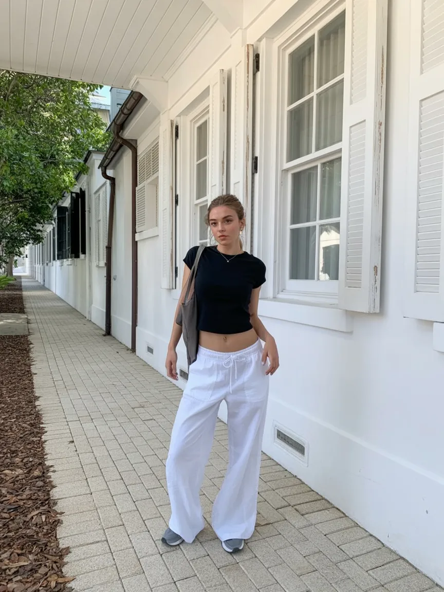 This look is all about clean contrast, and goodness, it works. A fitted black tee with loose white drawstring pants feels modern, minimal, and wonderfully cool for hot days when you still want to look a little put together. It has that quiet confidence I always come back to, where the outfit itself is simple but the silhouette does all the heavy lifting. There is a subtle Baddie vibe in the fitted top, but the loose pants soften it and make the whole thing feel more relaxed and wearable. It is sleek without being severe, and that makes it one of those appropriate casual Ideas that can easily move from school to an afternoon coffee run or casual evening plans.