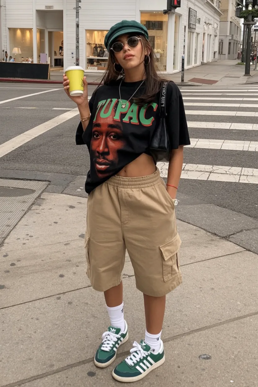 This one has attitude, and honestly, sometimes that is exactly what makes an outfit fun. The oversized graphic tee brings all the personality, while the khaki cargo shorts keep the look grounded and practical. It feels like streetwear with a casual school-day twist, and there is something very cool about the mix of bold graphics, sporty sneakers, and those roomy shorts. The whole thing has a bit of a Stockholm-style edge filtered through an American summer wardrobe, which is such an interesting combination. It is relaxed, confident, and a little tomboyish in a really modern way. For girls who are tired of overly sweet looks and want something with more punch, this has serious Inspo potential.