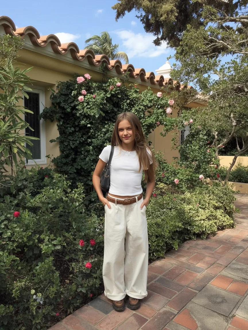 This outfit feels soft, polished, and quietly beautiful, like something you would wear on a school day when you want to feel especially put together. The fitted white tee keeps it simple, but the wide-leg cream pants make the whole look feel elevated and almost dreamy. There is something very European about it, especially with the neutral palette and relaxed tailoring. To me, it reads like summer confidence without noise. It is feminine without being precious, easy without being forgettable, and exactly the kind of outfit that makes you stand a little taller. If someone told me this was their go-to for feeling calm and stylish, I would believe them instantly. It is fresh, timeless, and full of subtle style power.