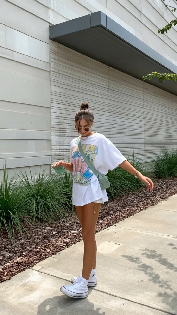 There is something so carefree about an oversized graphic tee worn almost like a statement piece all by itself. It has that sunny weekend mood that spills right into summer dressing, with a touch of playful Y2K attitude that still feels current in 2026. The slouchy white tee looks easy and expressive, while the hidden or barely-there shorts keep the silhouette long and relaxed. It is the kind of outfit that feels cool in every sense of the word: cool to wear in the heat, cool in photos, and cool in that effortless way girls are always trying to bottle. Add a crossbody bag and simple sneakers, and suddenly you have one of those Cute school-adjacent Ideas that looks spontaneous but is still stylish.