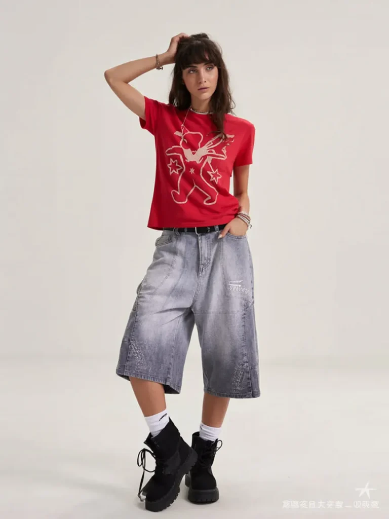This one has such a cool art-school feel to it. The bright red tee instantly lifts the mood, while the oversized washed shorts bring in that laid-back, slightly rebellious shape that makes the whole outfit stand out. It is not sweet, not too polished, and not trying to fit into a perfect little box, and that is exactly why it works. There is a strong fashion-girl energy here, the kind that feels expressive and confident without becoming costume-y. I can see this on someone who likes unusual proportions, loves an aesthetic that feels a little unexpected, and wants her school look to feel more personal than basic. It is bold but still wearable, which is a lovely combination.