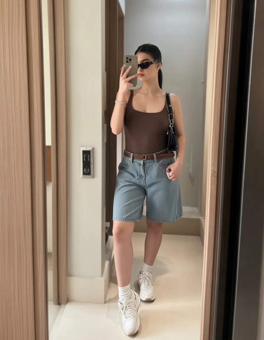 This look has that quiet confidence that always turns heads without trying too hard. The fitted brown bodysuit gives everything a polished, pulled-together feel, while the loose denim shorts keep it grounded in that relaxed summer mood we all want once school days get hot and busy. It feels a little European, a little Stockholm style, and still totally wearable for real life. I love how it lands right between dressed and effortless, like you knew exactly what you were doing when you got ready, but you still wanted to be Comfy. The belt and clean sneakers make it feel fresh and modern, and the whole outfit has that Appropriate trendy energy that works for hallway walks, lunch runs, or a casual after-school trip.
