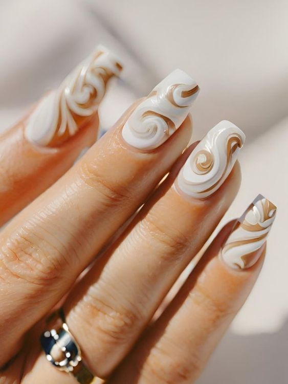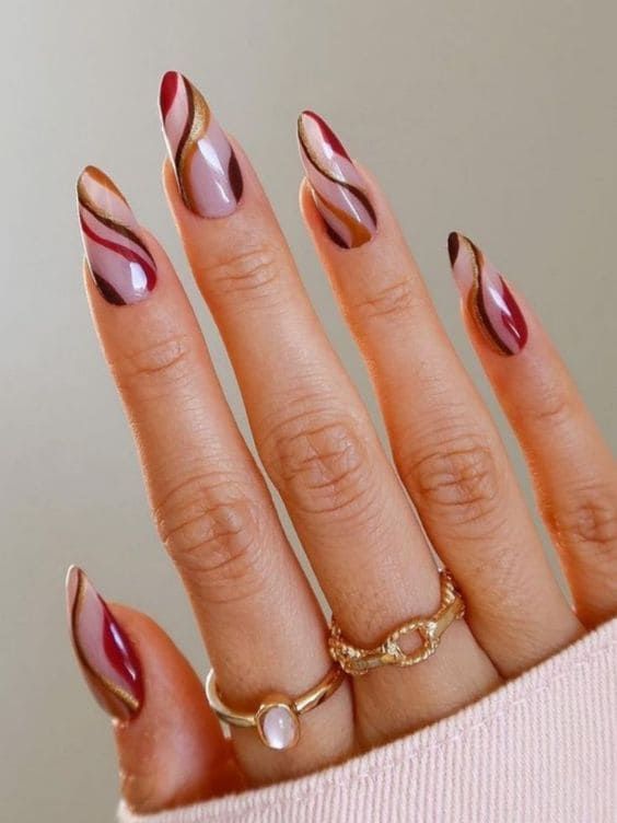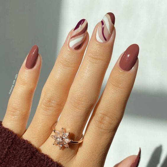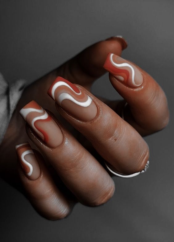 Embrace the earthy tones of fall with this abstract swirl design. Combining shades of brown, cream, and orange, these nails reflect the season’s natural palette. This look is particularly appealing for those who appreciate art and wish to display a unique style that tells a story.