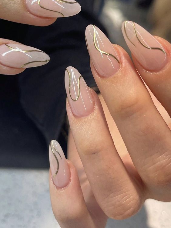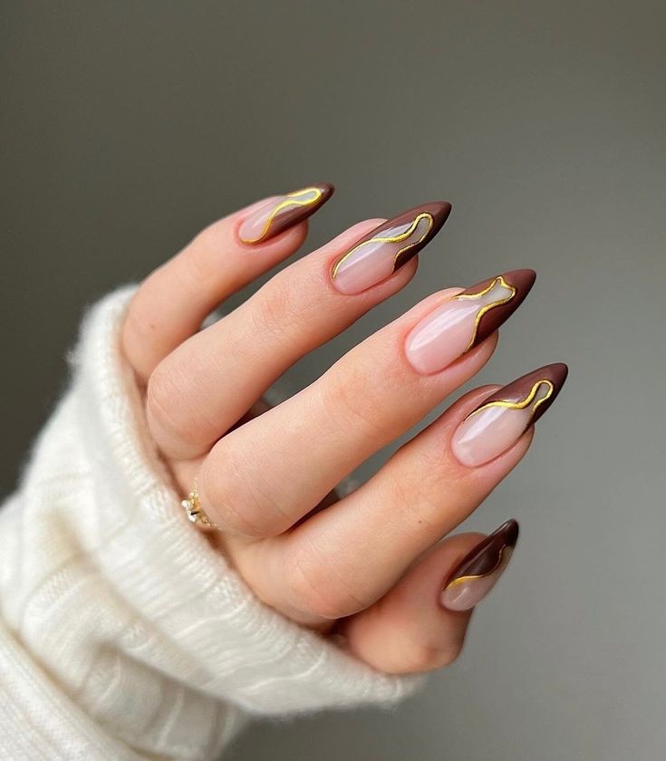 For a touch of luxury, opt for these exquisite swirls outlined in gold. The minimalistic design with a pink base and brown accents highlights the golden swirls, making them pop. This choice is perfect for evening events where you want to shine without overpowering your outfit.