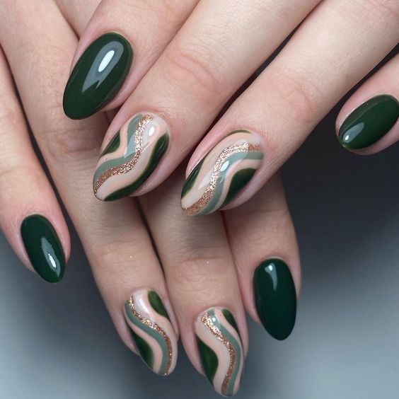 For those who adore classic styles, these matte nails in a deep forest green with cream swirls offer a quintessentially autumnal look. The matte finish provides a unique texture that beautifully contrasts with the glossy swirls, ideal for a sophisticated fall ensemble.