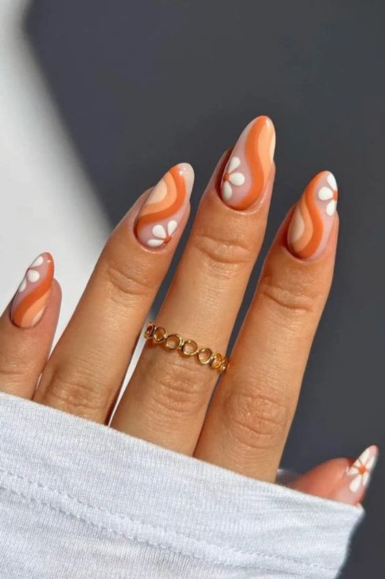 Dynamic and vibrant, these orange and cream waves offer a fresh take on fall nails ideas autumn swirl. The fluidity of the design mimics the whimsical wind patterns of the season, perfect for adding a playful element to your style.