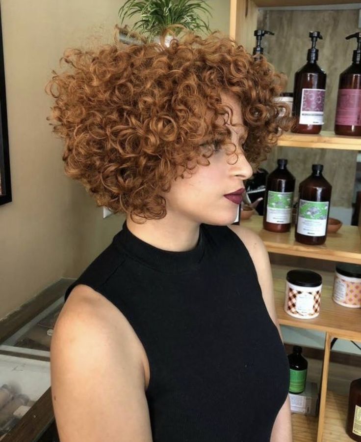 For those looking to embrace bold colors, this short bob in ginger is an eye-catching choice. The tight curls create a full and voluminous effect, perfect for making a statement in any setting. This hairstyle is especially stunning for natural hair enthusiasts and those who love warm tones.