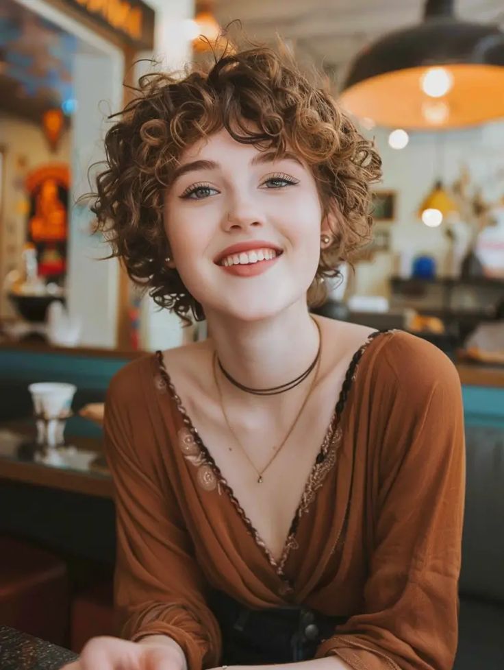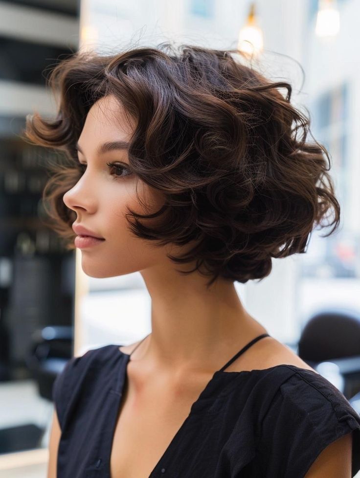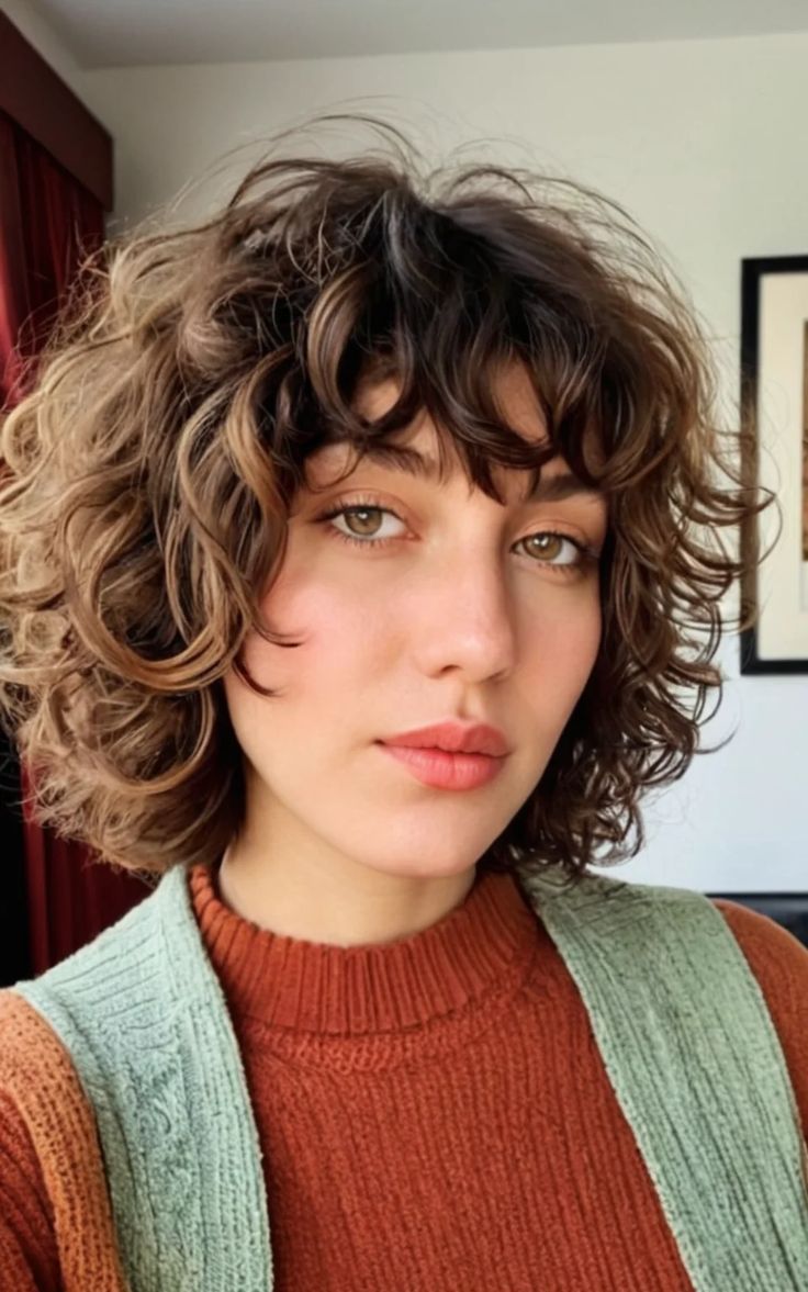 This short curly bob with bangs offers a playful and youthful vibe. The loose curls combined with the fringe frame the face beautifully, making it ideal for women with round faces. This is a versatile hairstyle that pairs well with both casual and formal outfits.