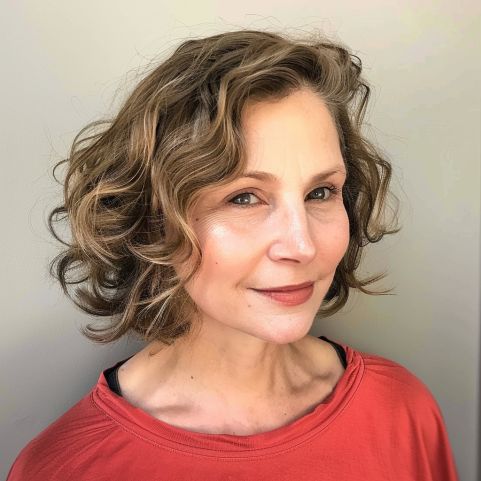This natural curly bob features soft, tousled curls that are effortless and stylish. The hairstyle radiates casual elegance, making it ideal for everyday wear. This look works particularly well for women who prefer a low-maintenance yet fashionable hairstyle.