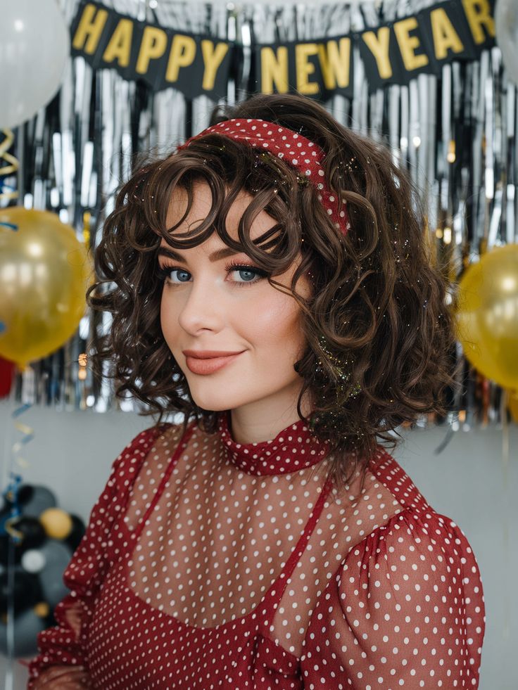 With a polka-dot headband and shimmering accents, this curly bob is the epitome of cute retro glam. The soft curls fall perfectly around the shoulders, making it an excellent choice for holiday parties or special events. The addition of the headband draws attention to the eyes, making this look irresistible.