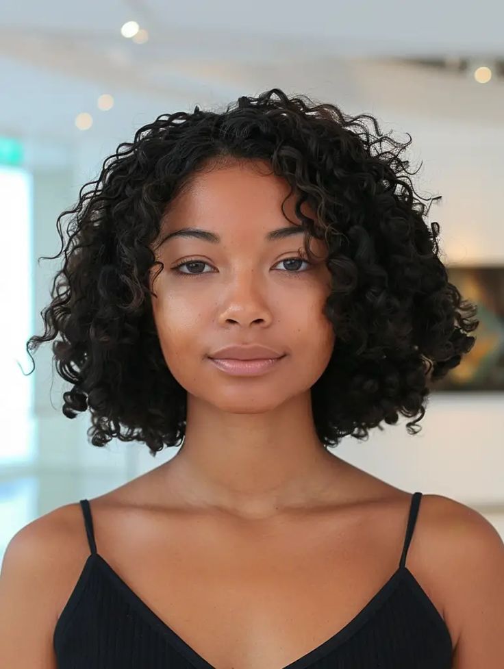 This curly bob showcases a beautifully compact cut, ideal for showcasing natural black hair textures. With a shorter length, this style emphasizes the natural curl pattern while keeping the overall look manageable. It’s perfect for women who want to embrace their natural hair while keeping it stylish.