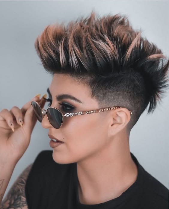 A bold, spiked mohawk with copper highlights that contrasts a dark base. The undercut on the sides adds a sharp, edgy look, while the textured top gives the hair volume and flair, perfect for those seeking a high-impact, modern hairstyle.