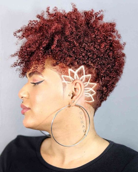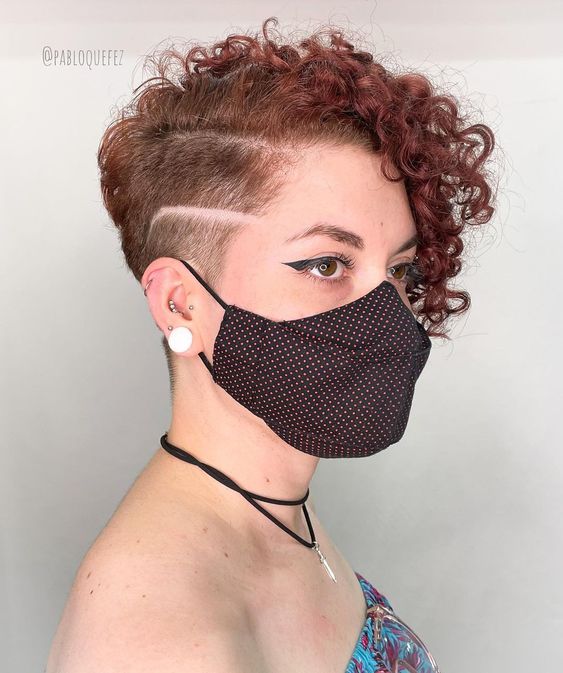 A fiery red curly hairstyle with a shaved side accented by a clean, linear design. The asymmetry between the full curls and buzzed side adds a unique flair, making it perfect for those wanting a playful, yet sharp, look.