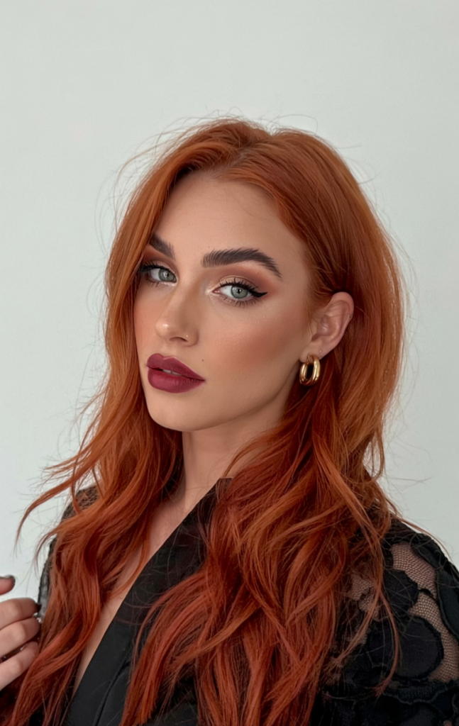 This warm coppery red brings life and light to the classic loose wave. It’s romantic without being too sweet, glamorous without being too serious. It gives off big “modern enchantress” energy — someone who walks into a room and owns it.