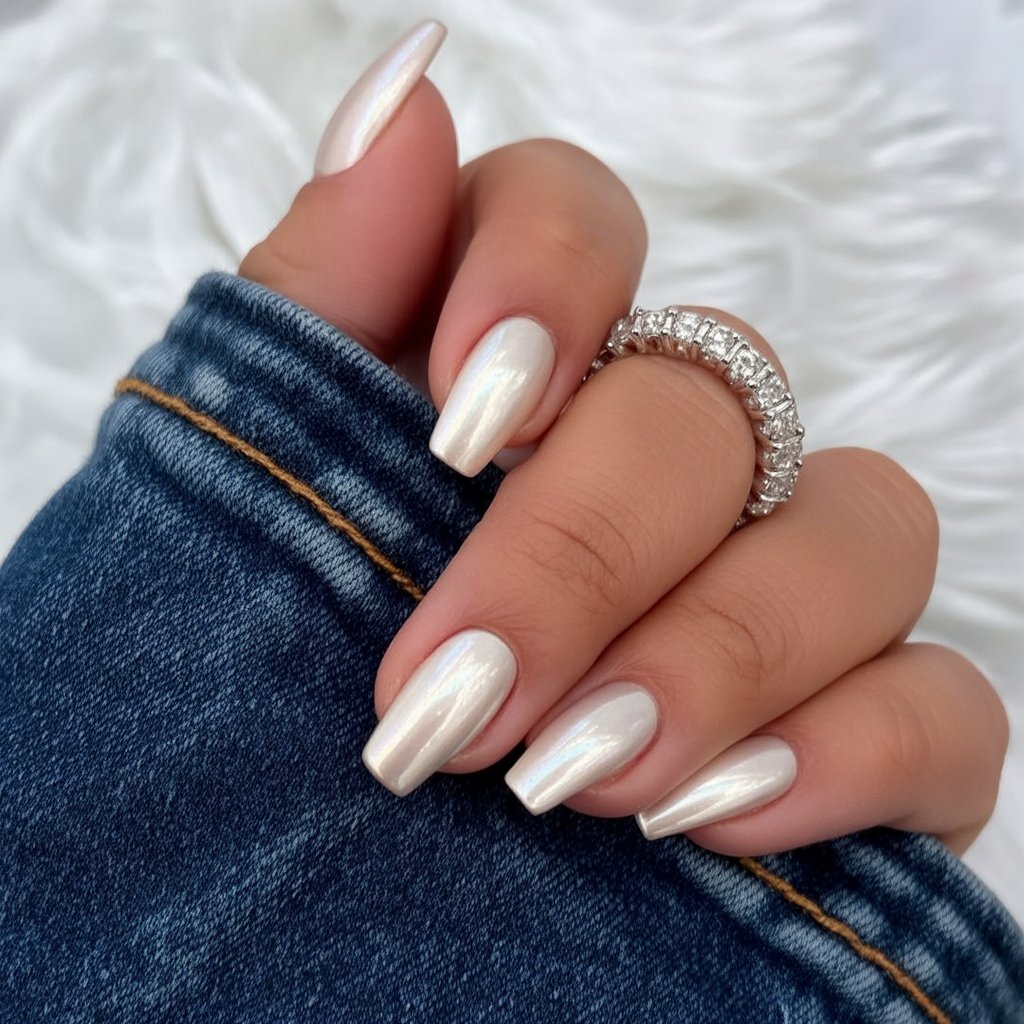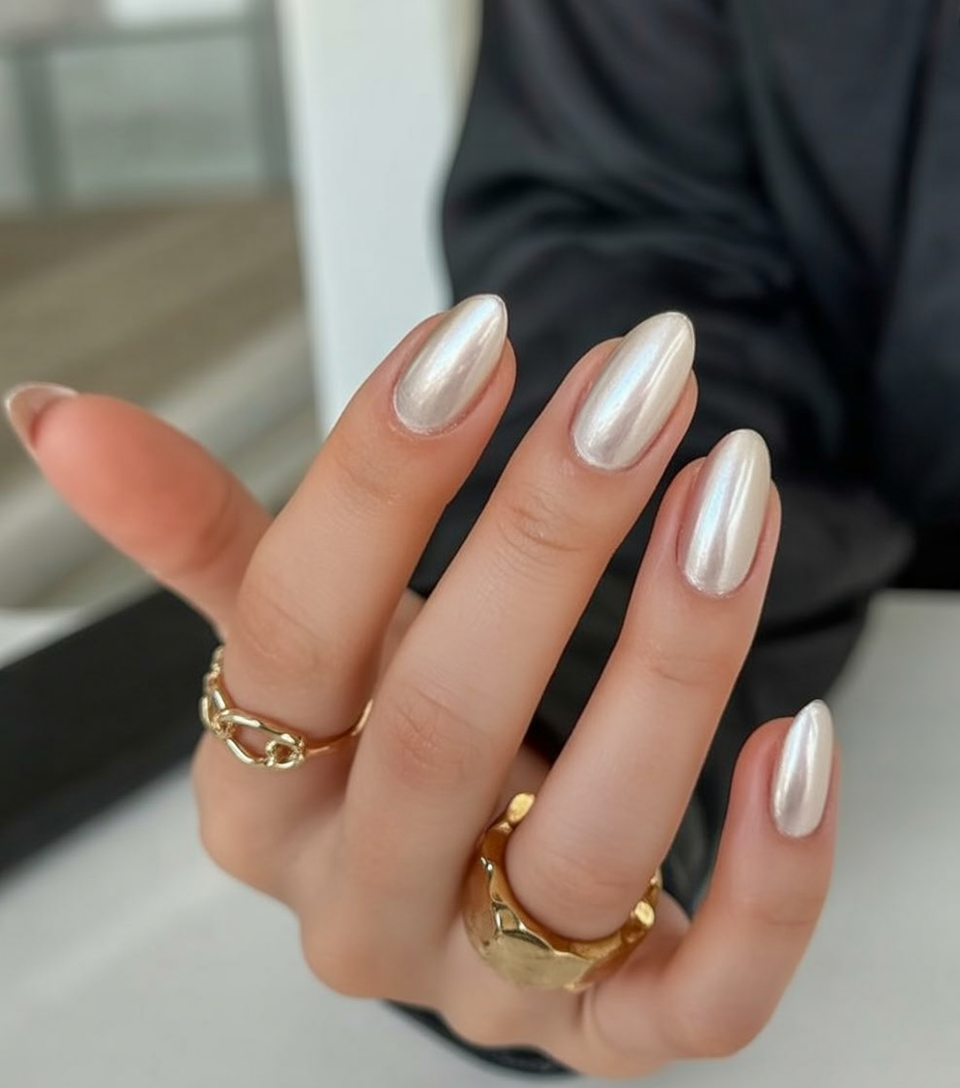 This kind of finish is trending because it’s basically a shortcut to looking polished: it reads neutral from a distance, but up close it has personality. If you want the glow to look smooth and not patchy, ask for an even chrome application over a perfectly buffed surface and a high-gloss seal. Keep your nails hydrated (hands too) so the pearly reflection stays luminous instead of dulling out.